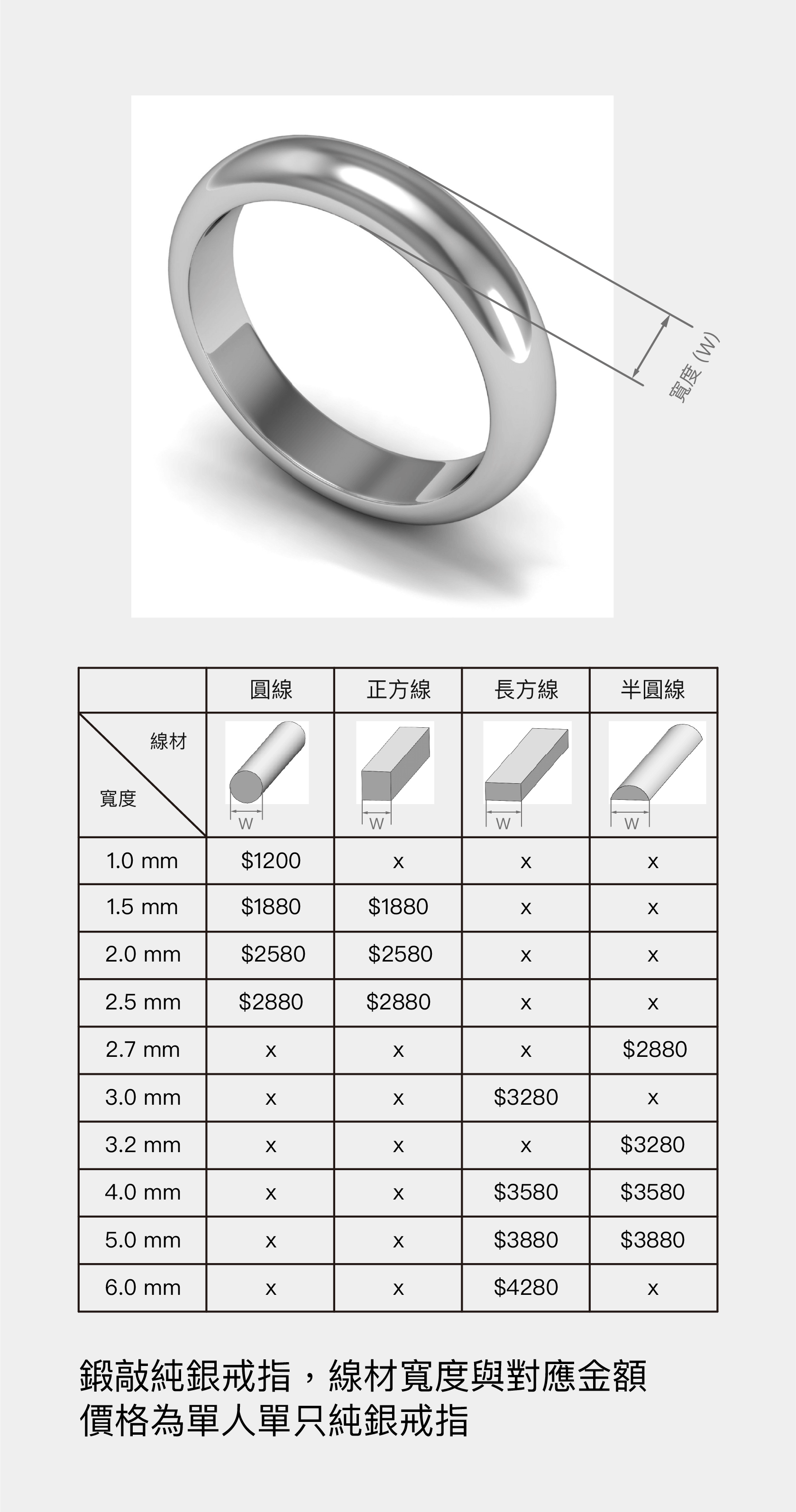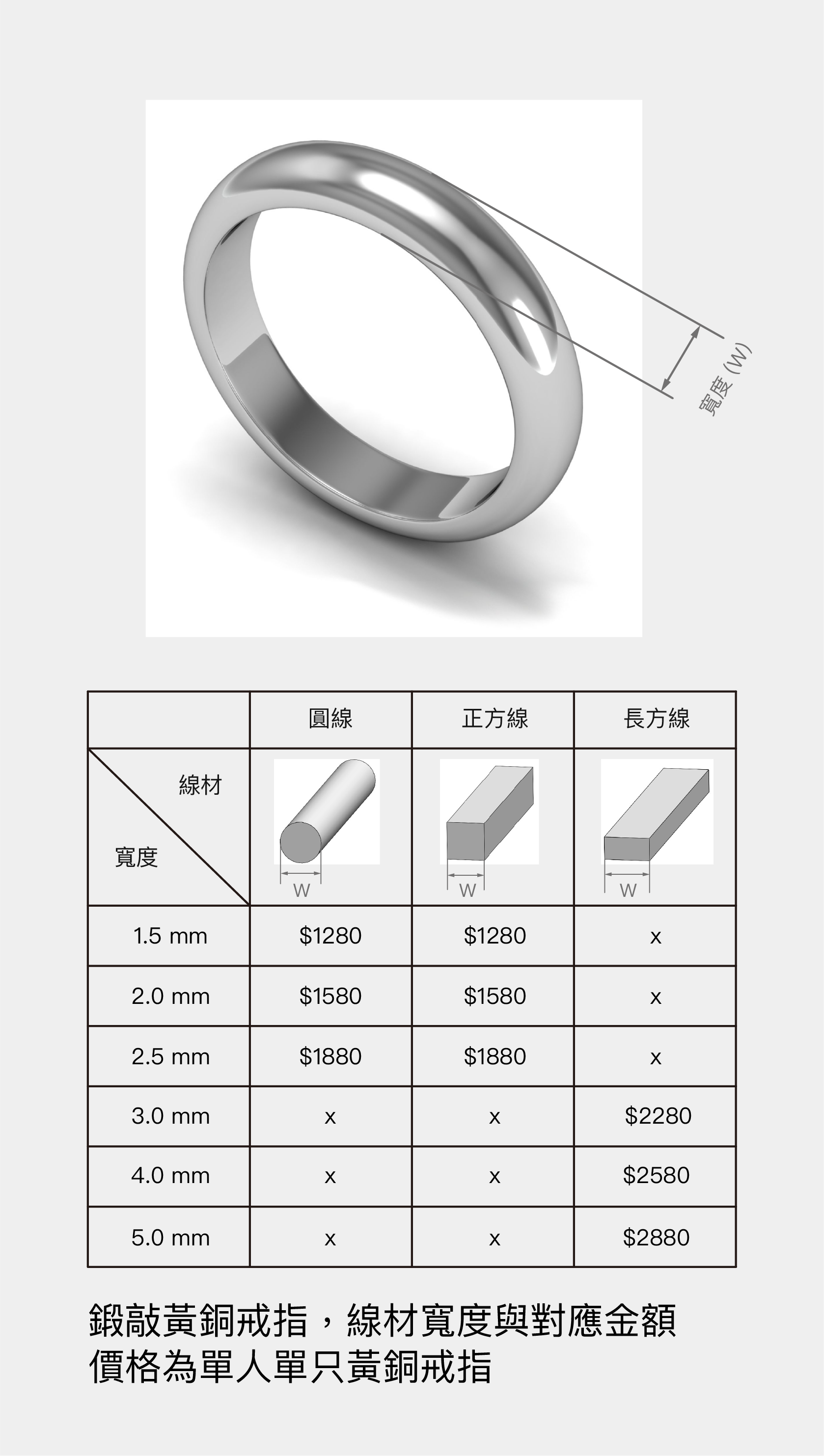 從線材選擇、戒寬造型、紋理搭配到敲字細節,